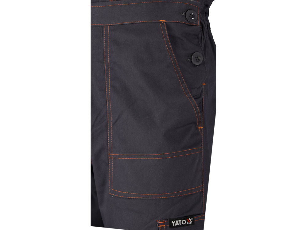 Calças de trabalho tipo arnês com sete bolsos, quatro dos quais com fechos de velcro e bolsos especiais para joelheiras.