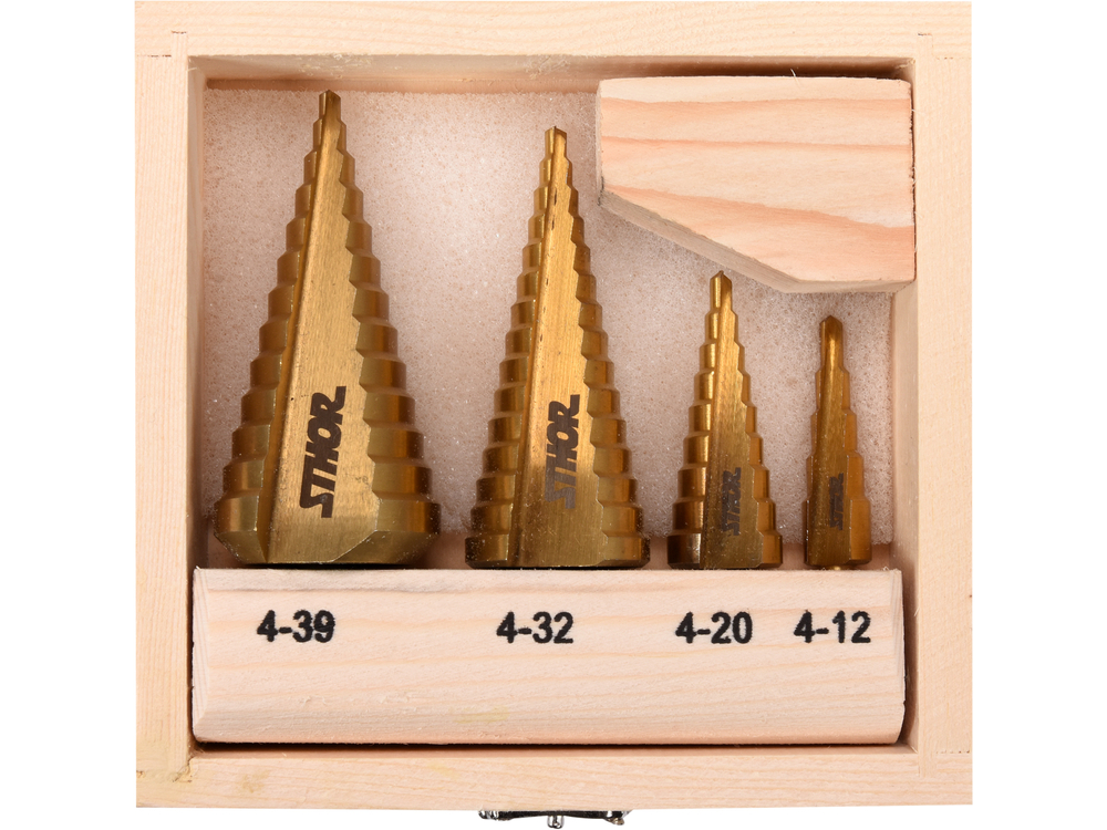 Um conjunto de brocas escalonadas concebidas para perfurar em aço inoxidável de alta qualidade, aço estrutural e laminado a frio, metais não ferrosos, chapas de aço, plásticos.