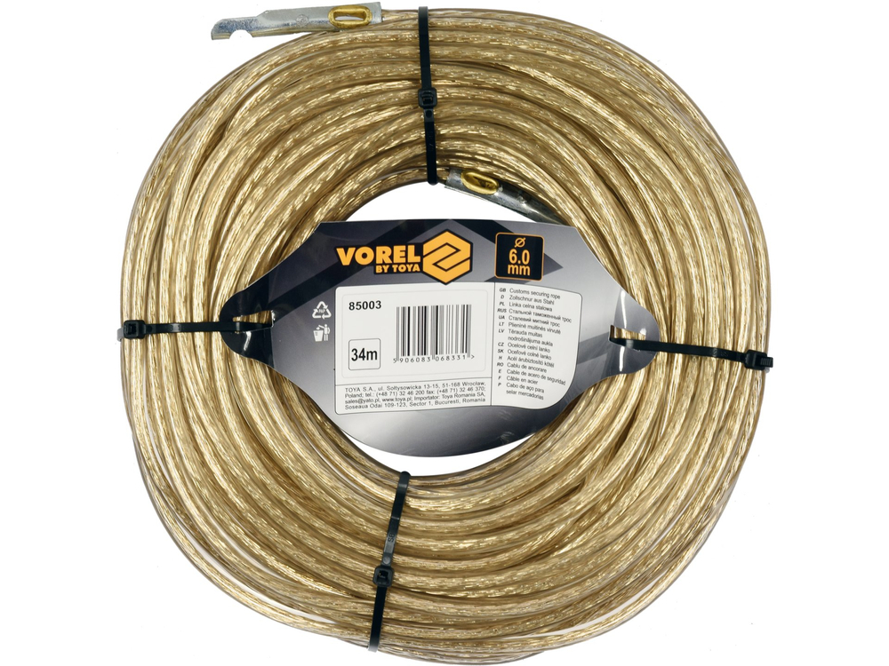 Cabo aduaneiro de arame de aço entrançado, resistente, utilizado no sector dos transportes. É utilizado para fixar os bordos da lona à parte lateral da carroçaria do veículo.