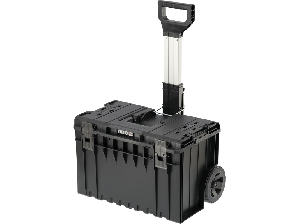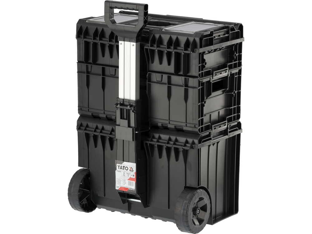 O conjunto de caixas móveis modulares YT-09161 permite uma arrumação cómoda das ferramentas e um transporte fácil. O conjunto inclui 3 componentes, que também estão disponíveis separadamente: caixa base com rodas YT-09166, contentor YT-09168, caixa YT-09169.