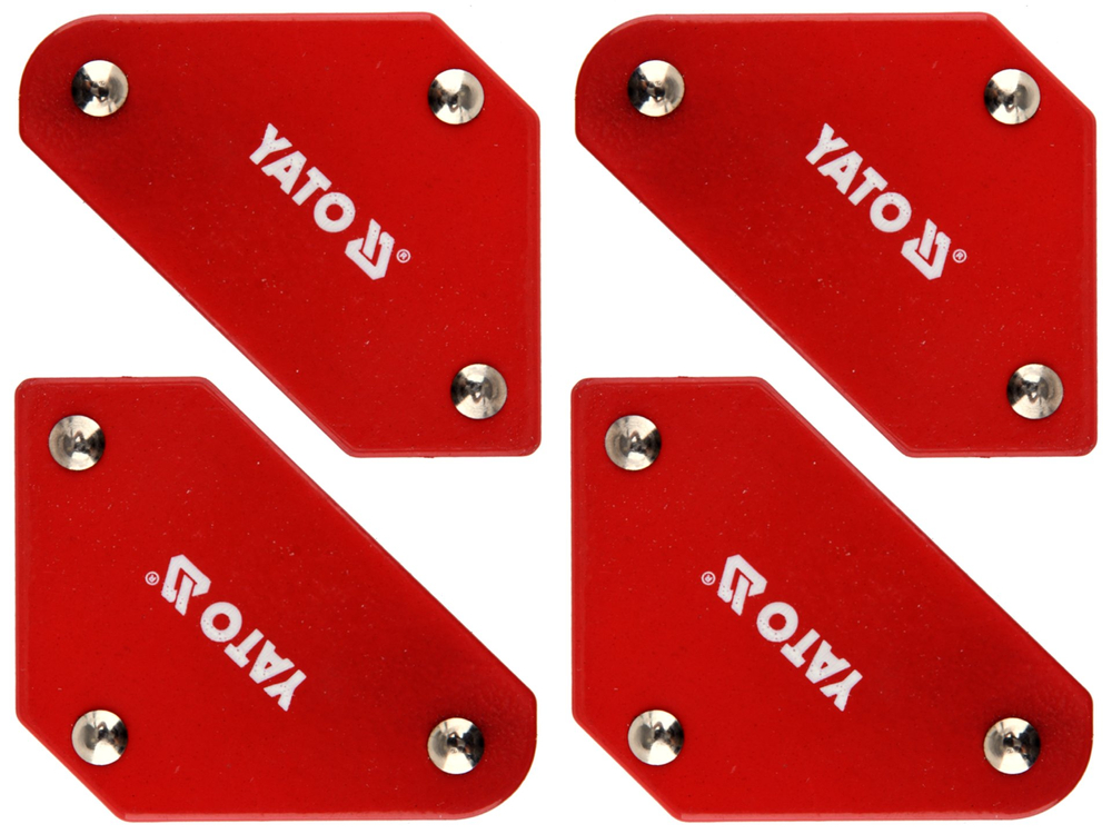 Conjunto de 4 mini ângulos magnéticos de soldadura YT-08677 fabricados em chapa de aço e ímanes de ferrite fortes. Superfície revestida a pó. Concebidos para a união temporária de peças metálicas durante a soldadura, perfuração e pintura.