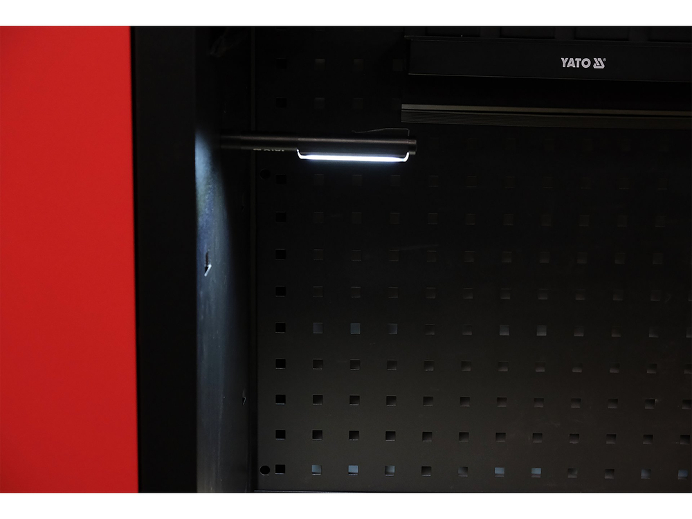 Lanterna de inspeção em alumínio Yato com 3 modos, incluindo uma luz de aviso vermelha. O LED COB fornece uma luz forte e difusa de 200lm. As caraterísticas adicionais incluem uma base magnética e um clip de metal.