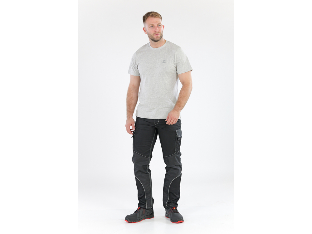 Calças de trabalho fabricadas em algodão de alta qualidade, poliéster resistente e elastano. O elastano dá elasticidade e faz com que as calças se ajustem melhor ao corpo. Sendo um material natural, o algodão é muito bem tolerado pelo corpo e é suave para a pele. O poliéster, embora leve, confere resistência e não absorve a humidade.
