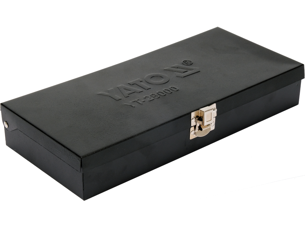 Aparafusadora de impacto da marca Yato com 168 mm de comprimento e 31 bits enegrecidos. A chave de fendas é feita de aço CrV durável, que resiste à deformação durante o martelamento, enquanto as pontas são feitas de aço S2 de alta qualidade.