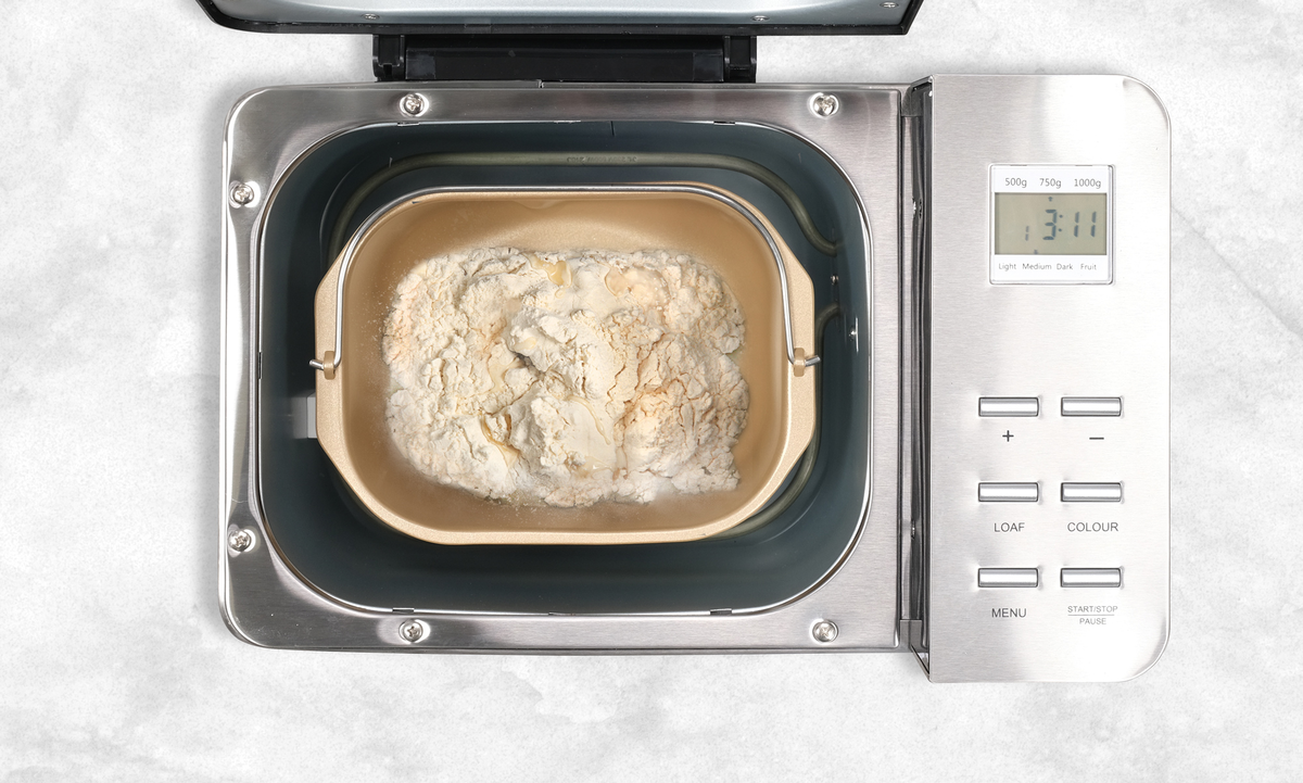 - Coloque os seguintes ingredientes alimentares: 240 ml de água, 2 colheres de sopa de manteiga, 1 colher de chá de sal, 2 colheres de sopa de açúcar, 3 colheres de sopa de leite em pó, 400 g de farinha, 1 colher de chá de fermento em pó. Coloque o fermento como último ingrediente, deitando-o sobre a farinha. O fermento não deve entrar em contacto com a água.