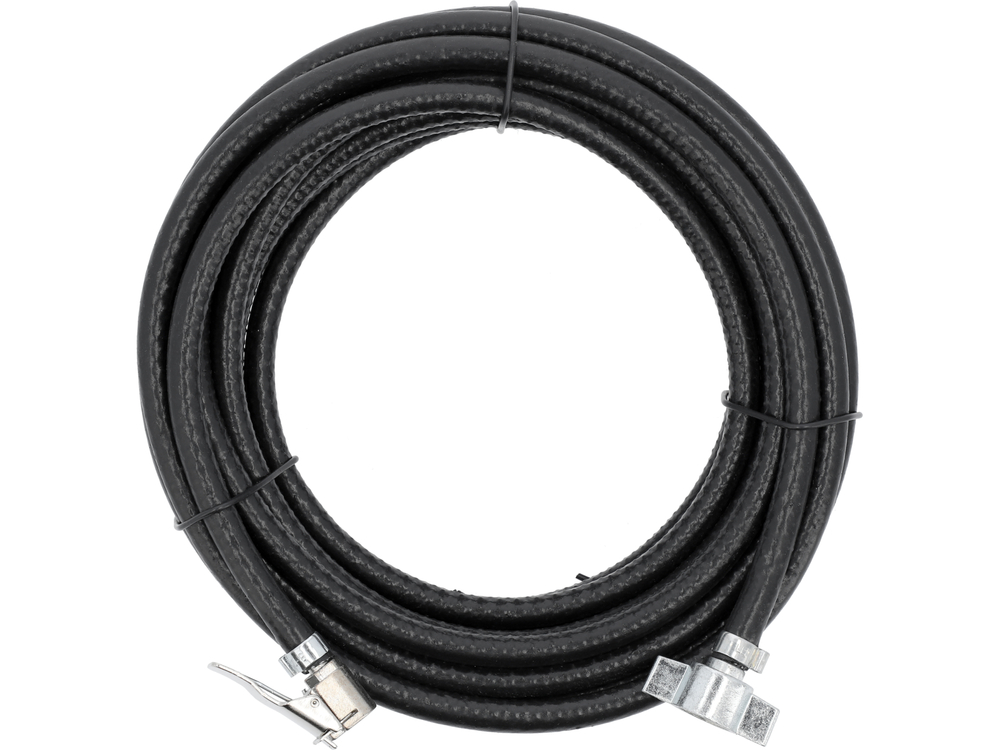 Mangueira de ar comprimido profissional e flexível. Adequada para veículos com compressor de ar. Para bombear em carrinhas, camiões, semi-reboques, tractores agrícolas, etc. Para bombear todas as rodas, mesmo em veículos muito longos. Extremidades da mangueira com acoplamentos em ambos os lados. De um lado, terminada com um conetor borboleta com rosca fêmea M16x1,5 mm, adequado para compressores de veículos. No outro, com um encaixe de compressão adaptado a uma válvula de automóvel padrão. A mangueira é construída com três camadas. A camada interior é feita de PVC macio e uma trança de reforço têxtil de poliéster denso. A camada exterior é feita de PVC resistente às intempéries.