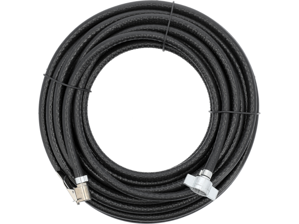 Mangueira de ar comprimido profissional e flexível. Adequada para veículos com compressor de ar. Para bombear em carrinhas, camiões, semi-reboques, tractores agrícolas, etc. Para bombear todas as rodas, mesmo em veículos muito longos. Extremidades da mangueira com acoplamentos em ambos os lados. De um lado, terminada com um conetor borboleta com rosca fêmea M16x1,5 mm, adequado para compressores de veículos. No outro, com um encaixe de compressão adaptado a uma válvula de automóvel padrão. A mangueira é construída com três camadas. A camada interior é feita de PVC macio e uma trança de reforço têxtil de poliéster denso. A camada exterior é feita de PVC resistente às intempéries.