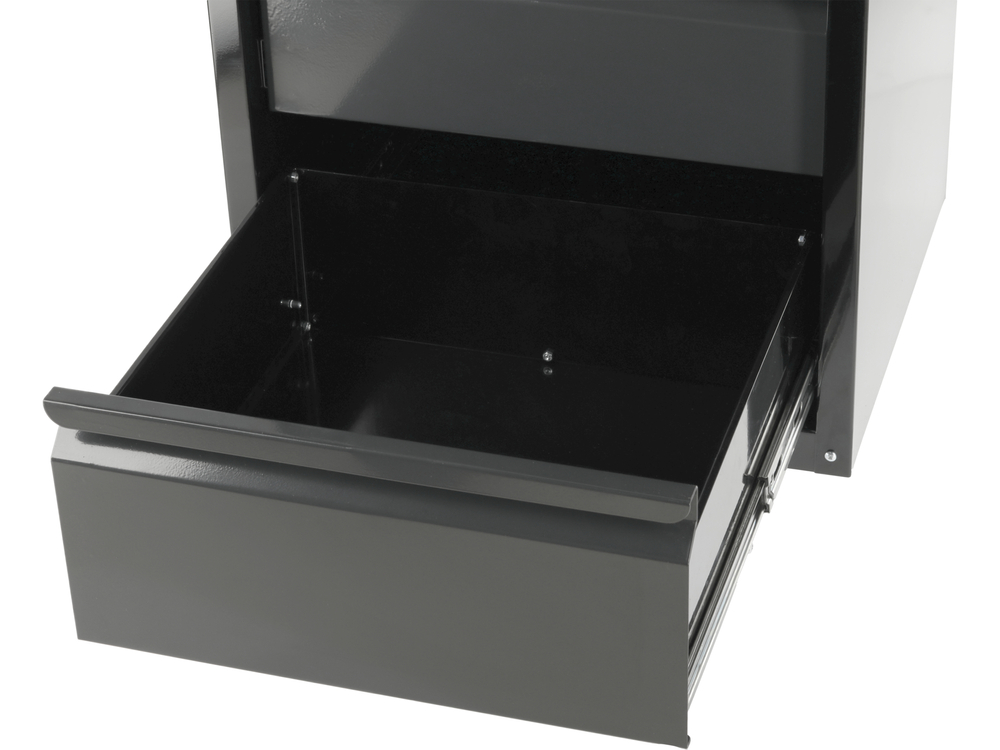 Um armário de oficina para ajudar a manter a sua garagem, oficina ou oficina de reparação automóvel arrumada. O armário é fabricado em chapa de aço lacada a preto. O acabamento elegante permite-lhe adaptar-se a qualquer oficina. Permite-lhe criar um espaço de trabalho confortável e assegura a arrumação segura das ferramentas. O armário é composto por um corpo no qual estão colocadas quatro gavetas sólidas com corrediças de rolamentos de esferas. O armário deve ser montado por si.