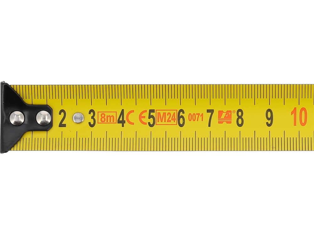 Fita métrica retrátil com uma fita de aço extra larga de 25 mm e um comprimento de 8 metros. Fabricada com precisão de medição de classe II. Equipada com um cordão curto que pode ser convenientemente passado à volta do pulso ou pendurado na fita métrica.