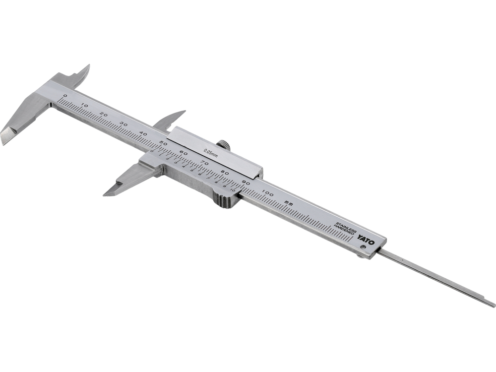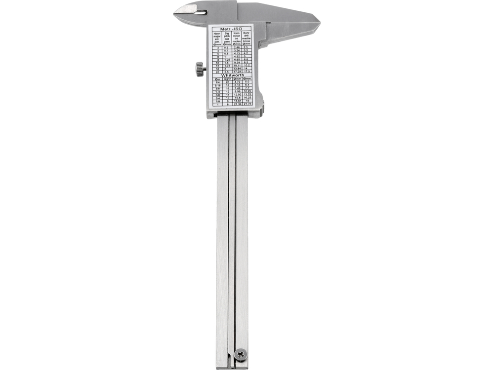 Paquímetro em aço inoxidável para medir o comprimento, a altura, a profundidade e o diâmetro interior e exterior. Permite medições na gama de 0-100 mm com uma precisão de 0,05 mm. A graduação clara e legível garante a exatidão e a facilidade de leitura dos valores indicados.