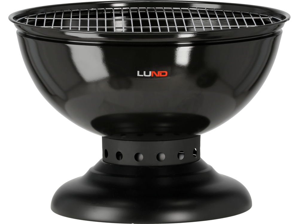 Fogão de jardim em aço com grelha cromada e tampa de proteção contra as faíscas / conteúdo da taça. O seu tamanho e peso reduzidos garantem a liberdade de colocação no terraço ou numa parte designada do jardim, bem como a sua fácil arrumação. A superfície da grelha permite preparar com sucesso uma refeição para várias pessoas, acomodando produtos de carne, peixe, legumes, etc.