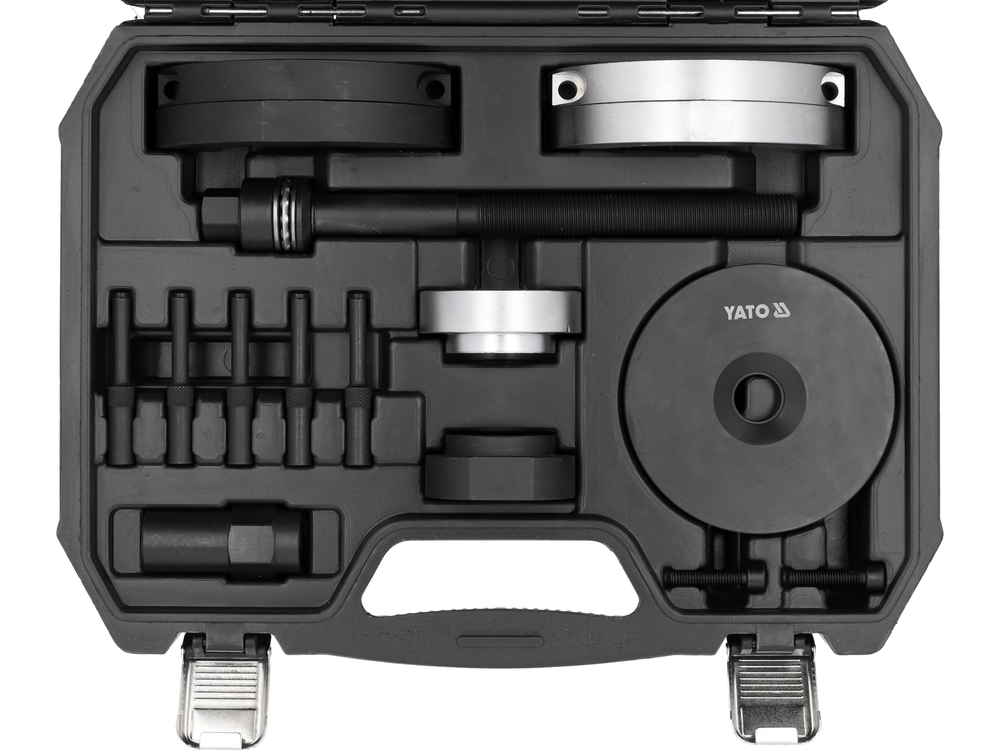 Conjunto de ferramentas para desmontar e instalar a unidade de rolamento e cubo em automóveis VW, Audi, Seat, Skoda. Reduz o risco de os danificar durante os trabalhos de manutenção, graças ao ângulo de trabalho correto. Não é necessário desmontar os componentes da suspensão.