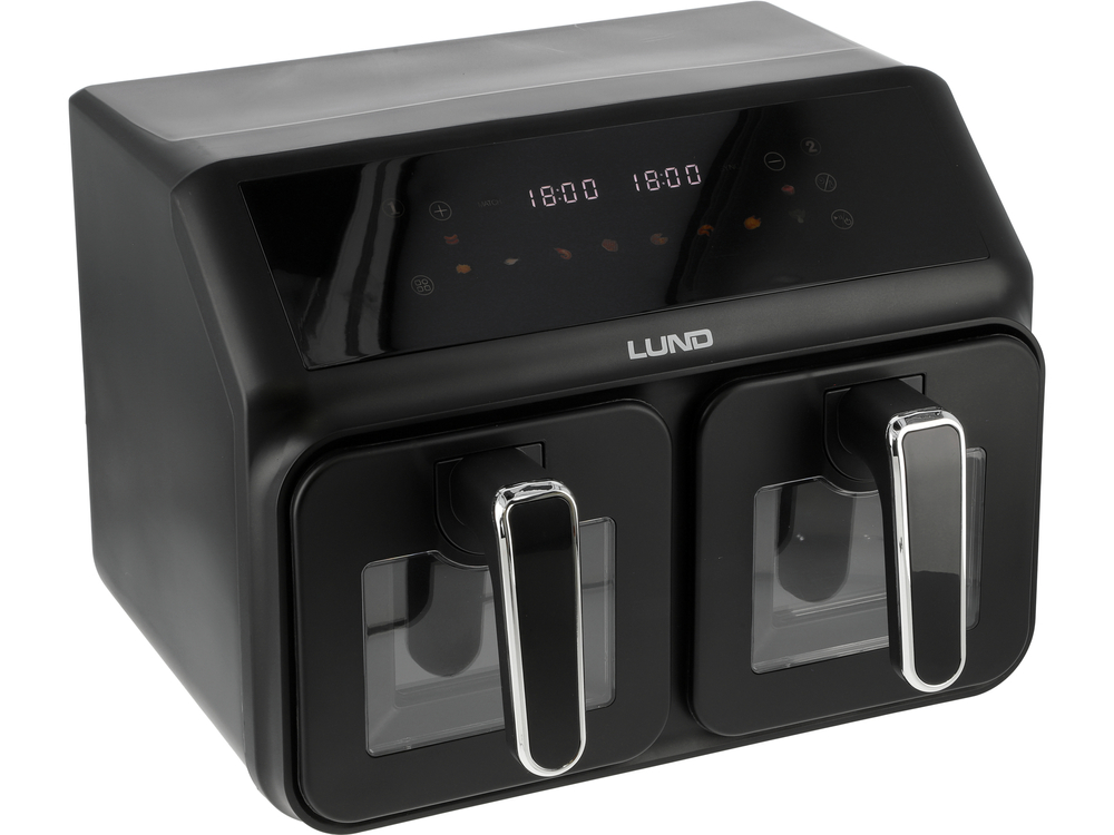 A fritadeira multifuncional sem óleo, com duas tigelas separadas, é um dispositivo prático que substituirá vários equipamentos de cozinha, permitindo preparar refeições saudáveis e rápidas para toda a família e convidados. Possui revestimento antiaderente, o que significa que basta um pouco de gordura ou sua completa eliminação para preparar pratos saborosos e aromáticos. Permite descongelar, aquecer, assar, fritar e grelhar legumes, carnes, peixes, bem como doces e salgados.