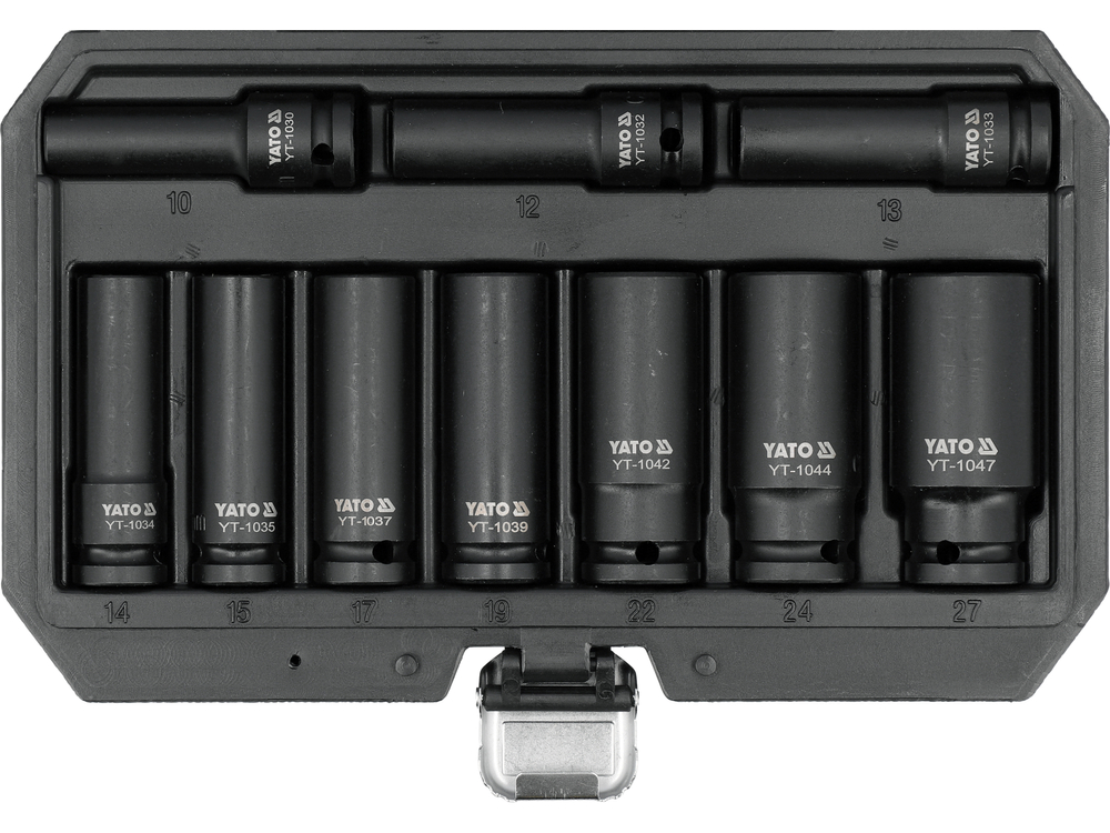- contém 10 soquetes sextavados de 1/2" nos tamanhos: 10, 12, 13, 14, 15, 17, 19, 22, 24, 27 mm