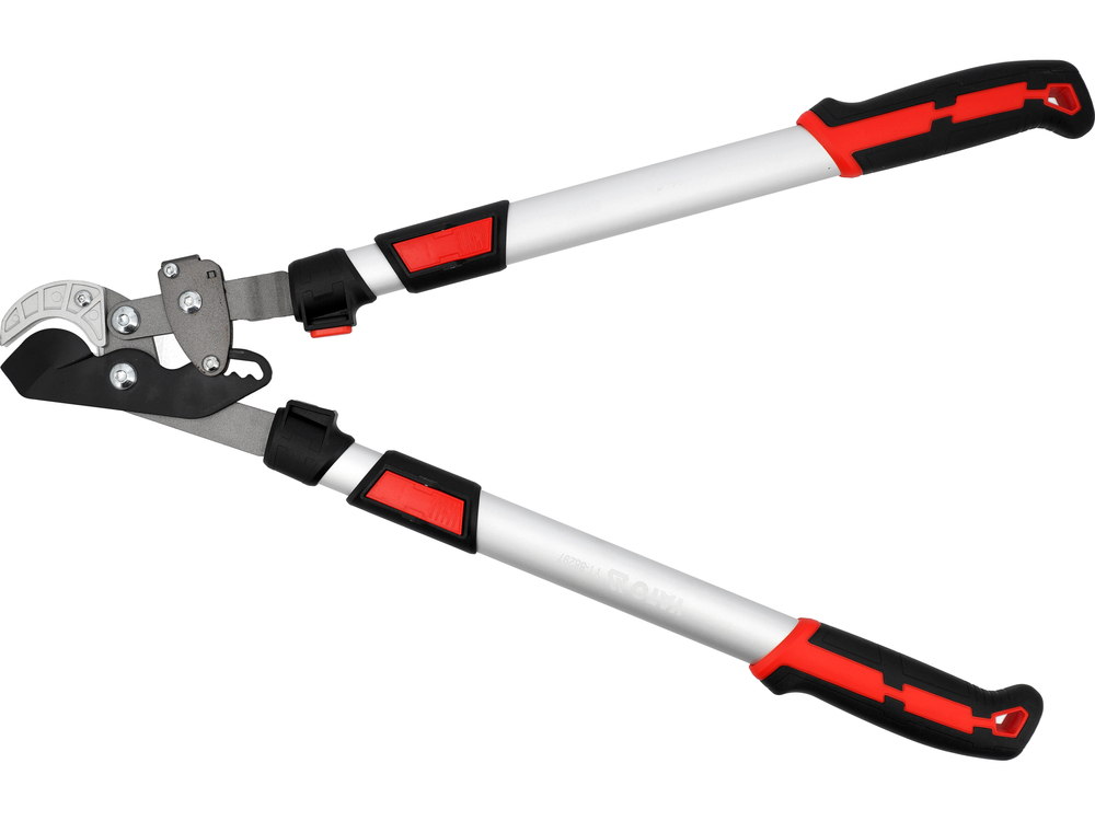 Sekator telescópico de catraca com mecanismo de três estágios, que aumenta a força de corte sem sobrecarregar as mãos. Projetado para conforto, precisão no trabalho diário e segurança do usuário, permite cortar galhos grossos com até 40 mm de diâmetro com menos esforço.