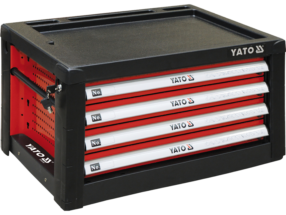 Profesionálna dielenská skriňa vybavená 4 centrálne uzamykateľnými zásuvkami. Majú guľôčkové výsuvy založené na viacguľôčkovom mechanizme pre vysoké zaťaženie. Pracovná skriňa má plastovú pracovnú plochu z materiálu ABS. Hrany skrinky sú chránené materiálom odolným proti nárazom. Skriňa s práškovým lakovaním má najvyšší štandard spracovania. Celkové rozmery skrine pracovného stola: 690 mm x 465 mm x 400 mm. Vnútorné rozmery zásuviek: 533 mm x 397 mm x 55 mm.