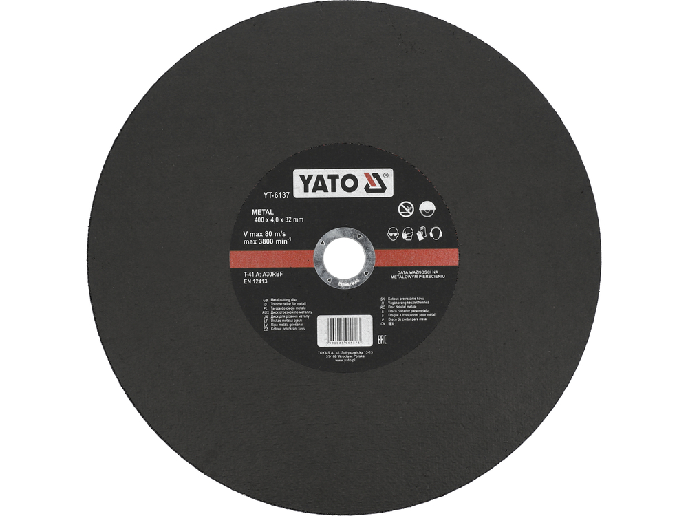Kotúč na rezanie kovov značky YATO vyrobený z vysokokvalitného brúsneho materiálu s vhodnou tvrdosťou a granuláciou.