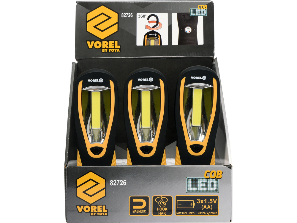 82726 je ručná lampa vybavená najmodernejšou LED diódou COB pre robustný, rozptýlený svetelný výkon. Svietidlo má magnet na zadnej strane krytu a otočný hák. Svietidlo je napájané batériami 3xAA, ktoré nie sú súčasťou dodávky.