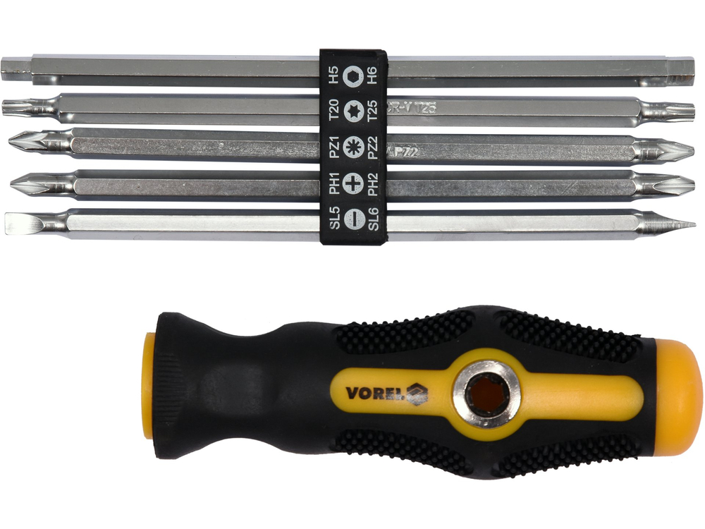 6-dielna sada obojstranných bitov s rukoväťou. Určené pre servisných technikov na uvoľňovanie a uťahovanie skrutiek v ťažko prístupných miestach.
