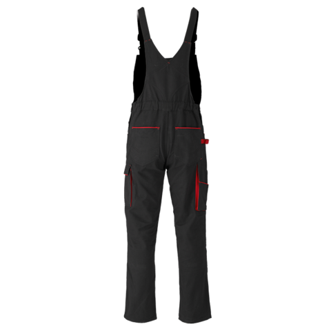 Deväť vreciek vrátane veľkého vrecka v oblasti hrudníka so zapínaním na zips a pútkom na kladivo vám pomôže udržať si poriadok. Látkové šle s nastavením a elastickou gumičkou na chrbte. Gombíky na bokoch s nastavením šírky pása a všitou gumou na chrbte. Vrecká na kolenách so zapínaním na suchý zips. Nohavice sú tmavej farby s červenými linkami, ktoré okrem dekoratívnej funkcie spevňujú a chránia okraje otvorených vreciek pred roztrhnutím.