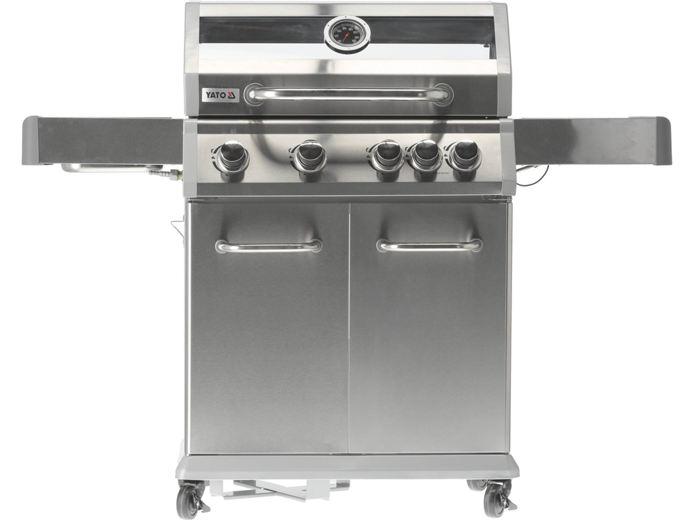 Plynový gril YATO Itami 4+1 s moderným dizajnom z nehrdzavejúcej ocele. Vybavenýliatinovým rebrovaným roštom s rozmermi 70 x 41,5 cm. Odnímateľný kruhový rošt (ø 30 cm) zabudovaný do rebrovaného roštu. Bočné poličky a priestranná uzatvárateľná skrinka uľahčujú skladovanie korenín a nevyhnutného príslušenstva. Medzi ďalšie funkcie patrí priestor na plynovú fľašu, nádoba z nehrdzavejúcej ocele umiestnená v jednej z bočných políc a zabudovaný otvárač na fľaše.