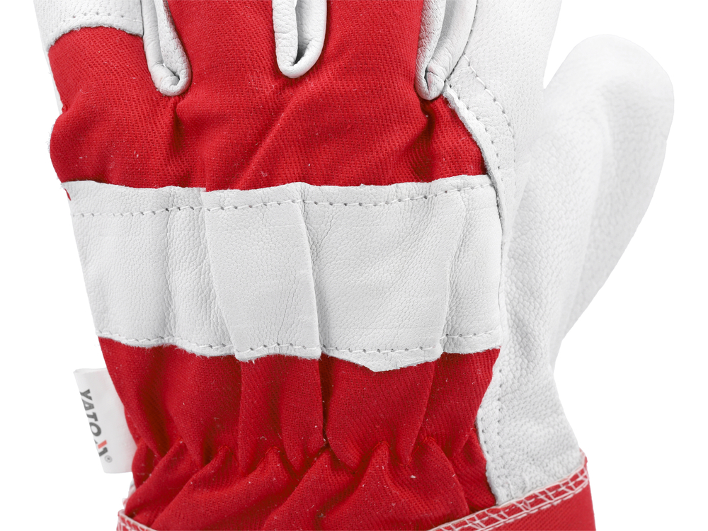 Stavebné rukavice z prírodnej kože a bavlneného úpletu v červenej farbe. Vďaka kvalitnej kozej koži sú rukavice veľmi príjemné na dotyk a zabraňujú nadmernému poteniu. Osvedčia sa najmä pri ťažkých stavebných prácach, v záhrade a tiež všade tam, kde sa nevyžaduje vysoká presnosť úchopu.