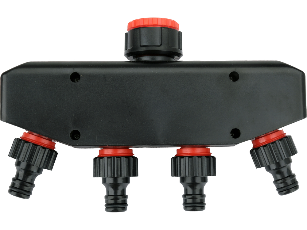 Rozdeľovač umožňujúci súčasné pripojenie až štyroch nezávislých vodných liniek k jednému kohútiku s zúbkom 3/4" alebo 1". Každý výstup je vybavený samostatným ventilom, čo umožňuje presné riadenie prietoku vody. Pripojenie je vyrobené z odolných materiálov ABS a POM, čo zabezpečuje pevnosť a spoľahlivú prevádzku aj v náročných vonkajších podmienkach.