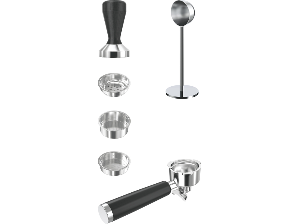- veľká profesionálna kolíba s hliníkovým lievom o priemere 52 mm na mletú kávu a sáčky ESE