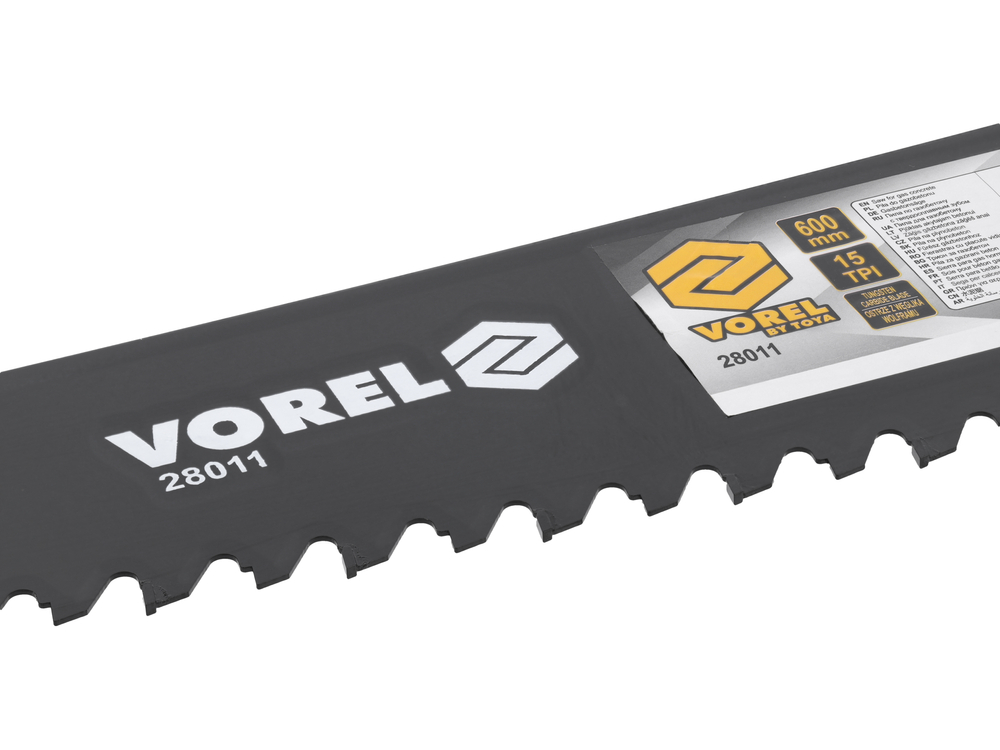 Sierra especial para aplicaciones de construcción con una longitud de 600 mm. Tiene 15 dientes de widia (es decir, cada dos dientes de sierra).