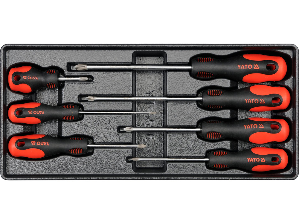 Inserto de cajón que contiene un juego de 7 destornilladores Phillips: PH0x100 mm, PH1x75 mm, PH1x100 mm, PH2x38 mm, PH2x100 mm, PH2x150 mm, PH3x150 mm