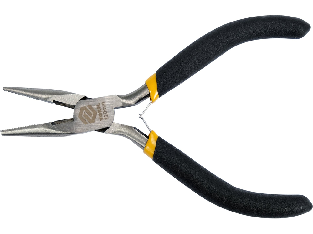 Alicates rectos alargados de 110 mm de longitud de Vorel. Superficie de la mandíbula dentada con hojas de corte perfiladas. Mangos cubiertos con cómodos capuchones de plástico. Diseñados para trabajos de precisión.