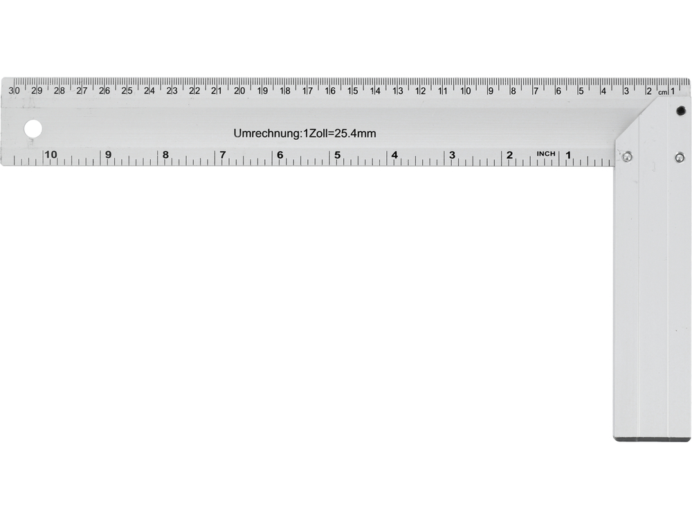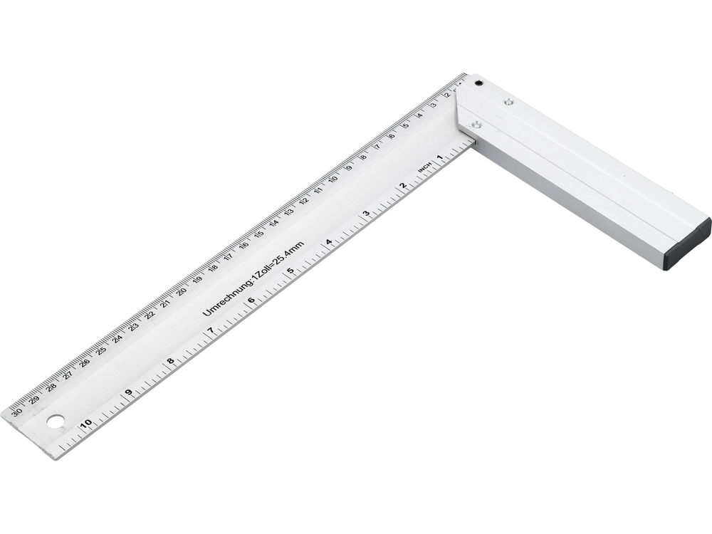 Escuadra con pie totalmente de aluminio endurecido, con graduaciones milimétricas negras legibles aplicadas. La unión entre el pie y el brazo marca un ángulo de 45°.