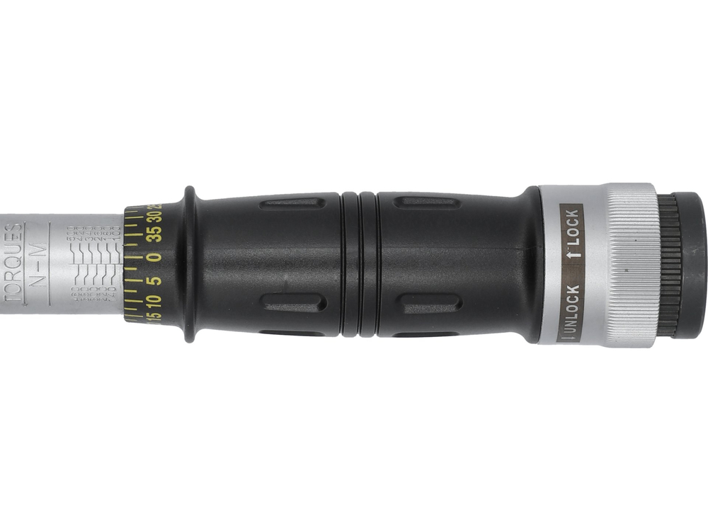 La llave está fabricada en acero al cromo vanadio para mayor durabilidad y resistencia. Tiene una tensión mecánica de carraca dinamométrica que, cuando se alcanza la fuerza de apriete deseada, salta un diente, emitiendo un sonido característico. La escala de par se encuentra en el mango de la llave y se ajusta girándola. Una vez ajustado el par de apriete deseado, bloquee la llave en su sitio con el seguro situado en el extremo del mango.
