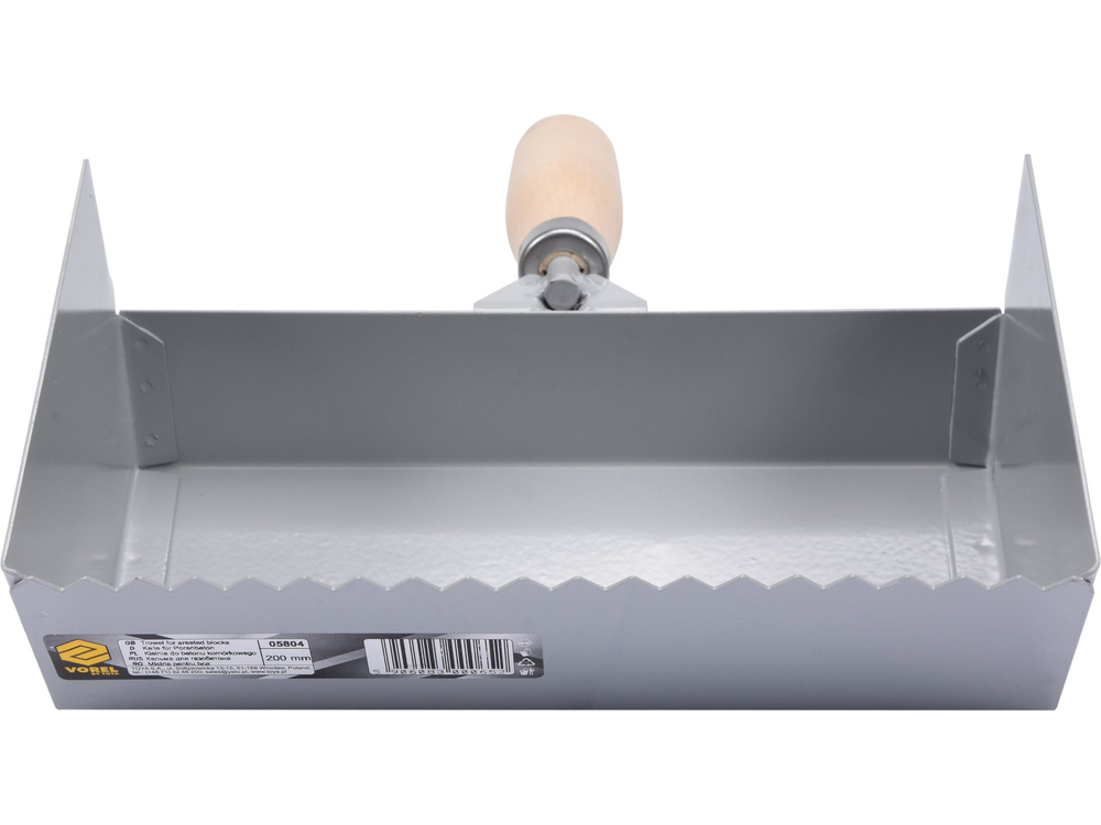 Llana de 200 mm de chapa lacada. Se utiliza para aplicar y distribuir mortero en bloques de hormigón celular. El diseño especial en forma de cubo permite al usuario recoger la cantidad correcta de mortero y el borde equipado con dientes permite distribuir uniformemente la mezcla sobre los bloques. La paleta está equipada con un gancho para colgarla y un cómodo mango de madera.