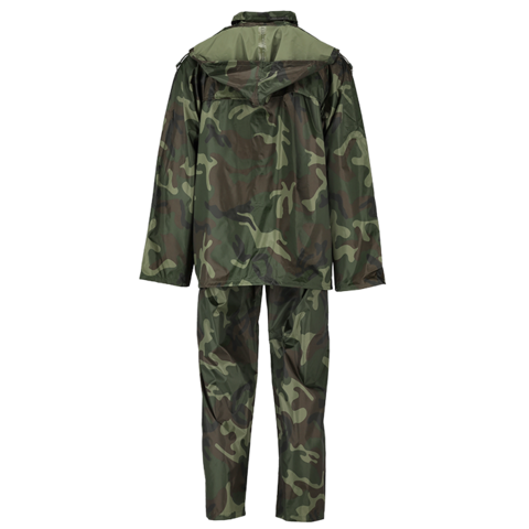 Conjunto de chubasquero moruno de dos piezas de Vorel. Chaqueta con dos grandes bolsillos y capucha ajustable, pantalón con cintura elástica y aberturas laterales por las que se accede a los bolsillos del pantalón.