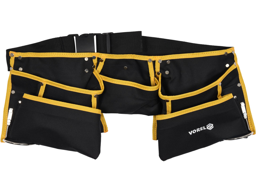 Cinturón de herramientas de carpintero con once bolsillos con dos soportes metálicos para martillos. Costuras reforzadas con remaches metálicos. Bolsillos fijados permanentemente al cinturón. Cinturón de transporte ajustable de poliéster 600D con hebilla a presión.