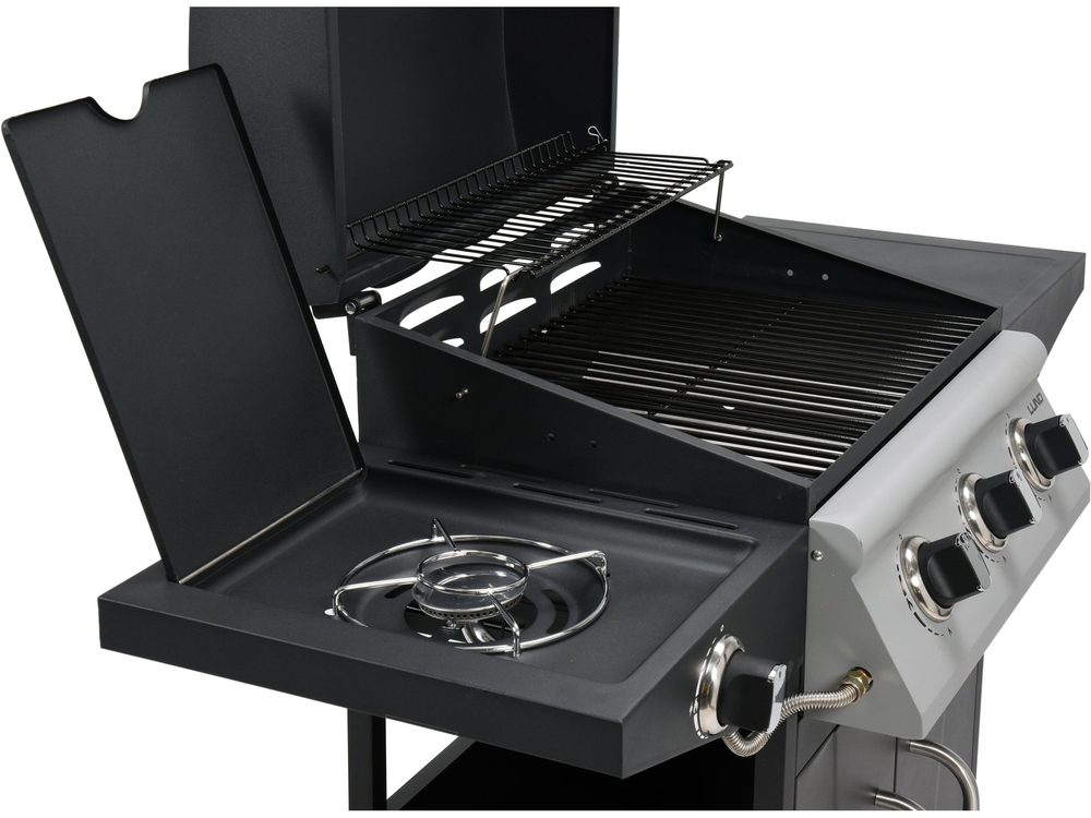 Parrilla de gas profesional 3+1 para cocinar al aire libre, con cómodo ajuste para una cocción perfecta de los alimentos. Los estantes laterales y un espacioso armario con cerradura le facilitarán el almacenamiento de condimentos y accesorios esenciales. El quemador lateral de 3,2 kW le permitirá cocinar y calentar alimentos en una olla o sartén