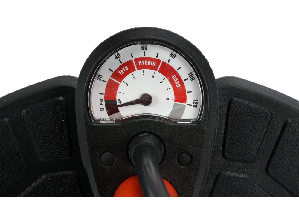 Bomba manual de poste con una presión máxima de 8 bar. Tiene un cabezal universal para bombear válvulas de coches y bicicletas.