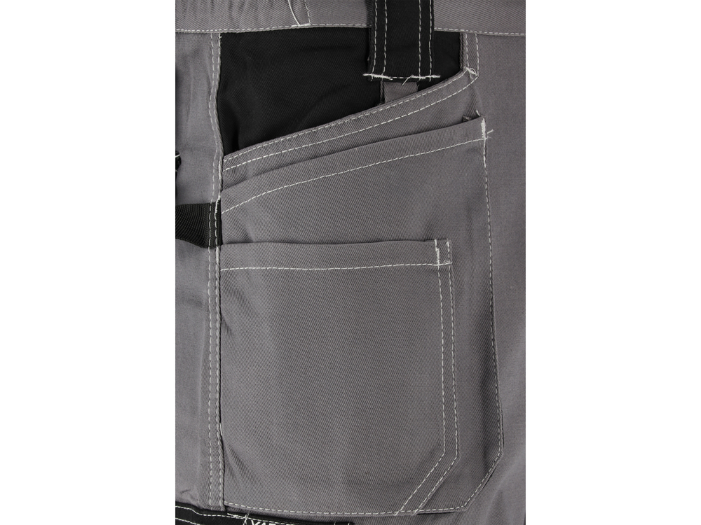 - debajo de la cintura, bolsillos multifuncionales en la parte delantera, incluidos dos bolsillos principales, tres bolsillos de parche y, en el lado izquierdo, trabillas textiles cosidas para, por ejemplo, cinta métrica, destornillador, alicates