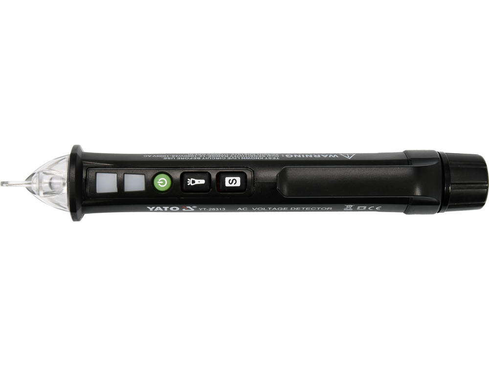 El comprobador de tensión inductiva YT-28313 permite detectar la tensión alterna en cables eléctricos en dos rangos 48-1000 V y 12-1000 V, así como detectar la rotura de un cable bajo tensión. La eliminación del contacto directo entre la cuchilla y el conductor aislado aumenta la seguridad del usuario. La detección de tensión se indica mediante un LED y una señal acústica.