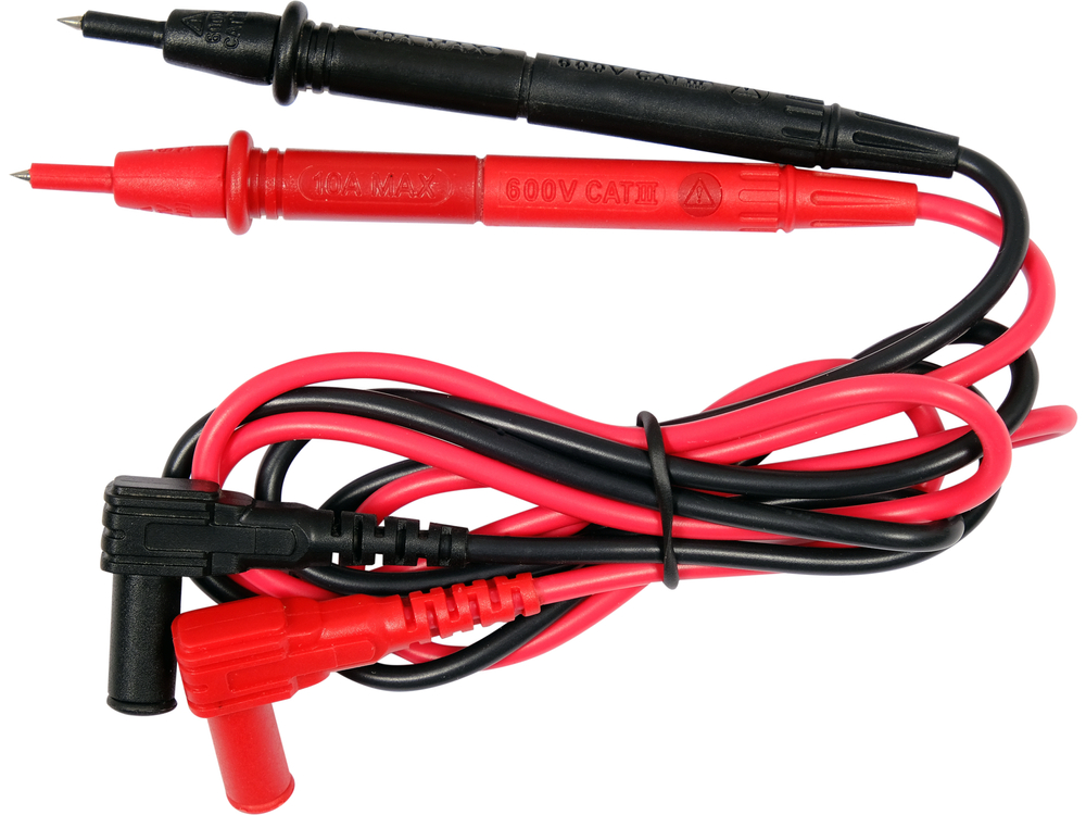Juego de sondas de medición que incluye cocodrilos. Se adapta a la mayoría de los medidores del mercado. Contactos afilados con capuchones desmontables. Las pinzas de cocodrilo se pueden colocar después de quitar el capuchón.