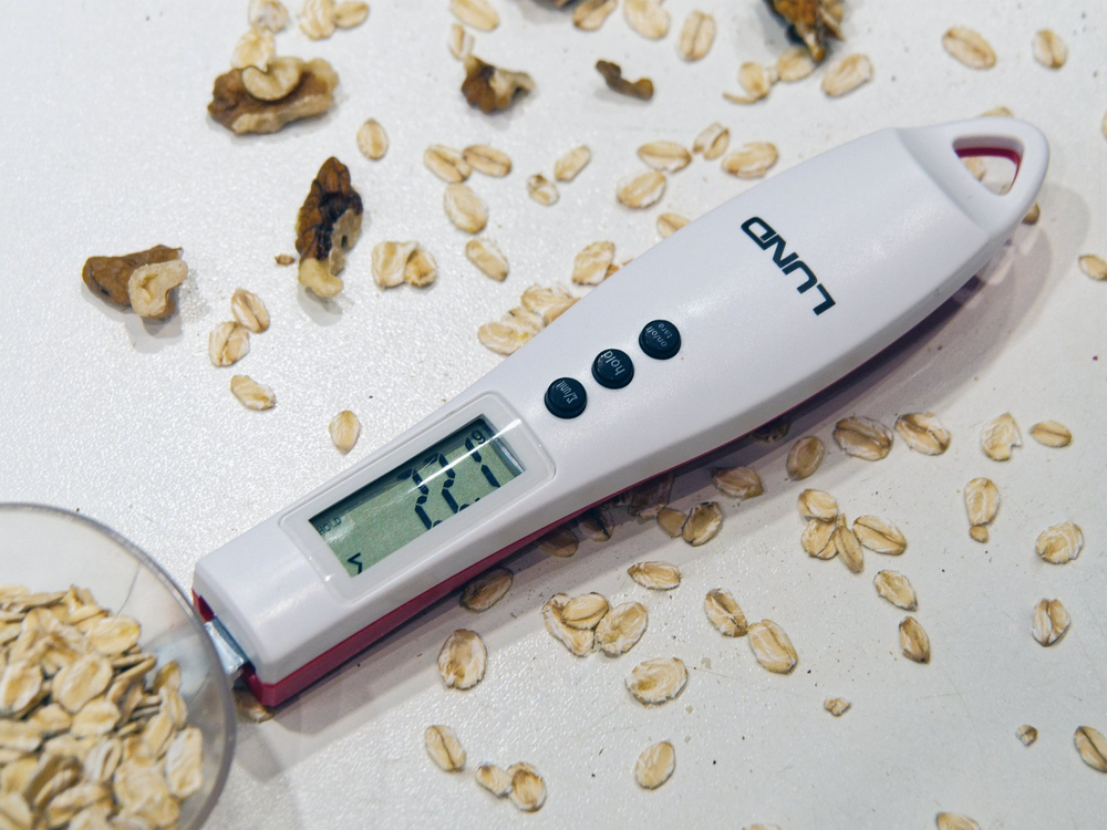 Báscula de cocina LUND con cuchara con una capacidad total de 75 ml y una carga máxima de 300 g. Equipada con una pantalla LCD de fácil lectura que muestra 2 unidades de peso a elegir e indicadores de sobrecarga y batería baja. Dispone de hasta 4 útiles funciones: medición, retención de dígitos en pantalla, suma y tara.