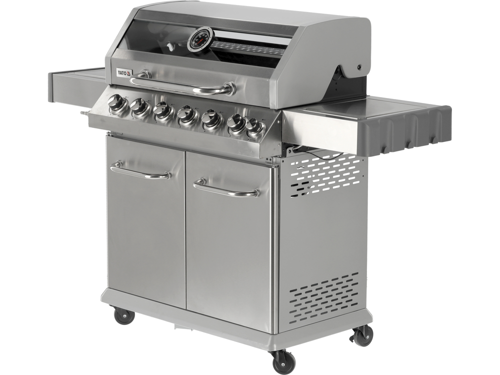 Barbacoa de gas 6+1 de diseño moderno fabricada en acero inoxidabley equipada con una parrilla de hierro fundido de 82 x 41,5 cm. Rejilla circular (ø30 cm) integrada en la rejilla acanalada. Los estantes laterales y el amplio armario con cerradura facilitan el almacenamiento de especias y accesorios esenciales. El quemador lateral de 2,2 kW permite cocinar y calentar alimentos en una olla o sartén. Otras características son el espacio para una botella de gas, un recipiente de acero inoxidable situado en uno de los estantes laterales y un abridor de botellas integrado.