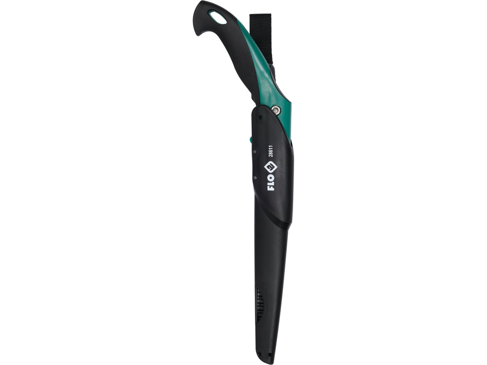 Sierra plegable de acero al carbono SK5, hoja recubierta de PTFE. Dientes de sierra templados por inducción, afilados por tres lados. Esto permite a la sierra cortar en ambas direcciones. Mango recubierto de material TPR engomado para un agarre seguro. Viene con una funda para trabajar y guardar cómodamente.
