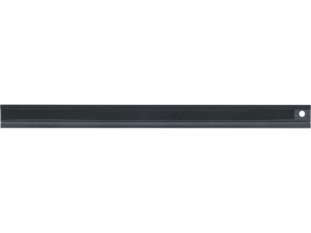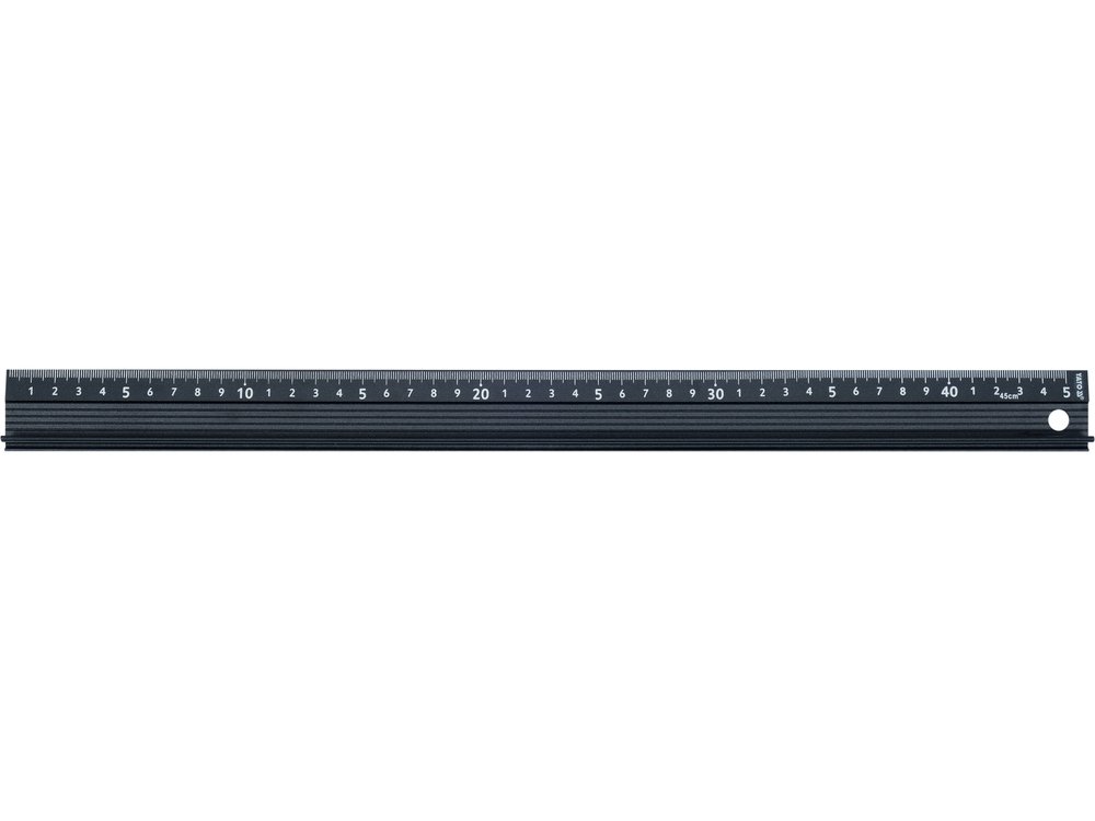Regla de aluminio con un perfil en la parte superior que sirve de agarre seguro para sujetar la regla mientras se corta. El plano inferior está forrado con una tira de espuma para proteger el material que se está midiendo. La regla tiene un orificio para colgarla y facilitar su uso.