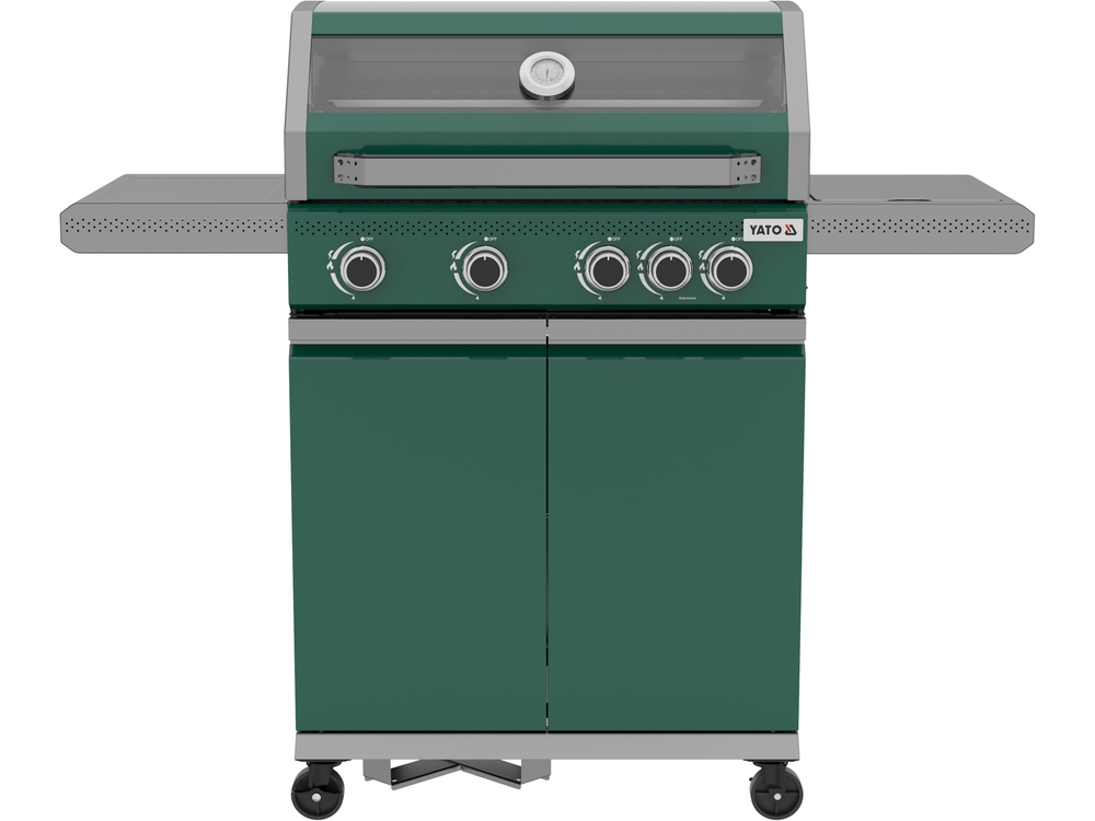 Barbacoa de gas moderna 4 + 1 de la serie YATO Itami en un único color verde y gris. Equipado con una parrilla de hierro fundido confiable de 68 x 42 cm y una rejilla de calentamiento de acero inoxidable. La potencia total de los quemadores es de 14,2 kW. Los estantes laterales y el amplio armario cerrado facilitan el almacenamiento de especias y accesorios necesarios.