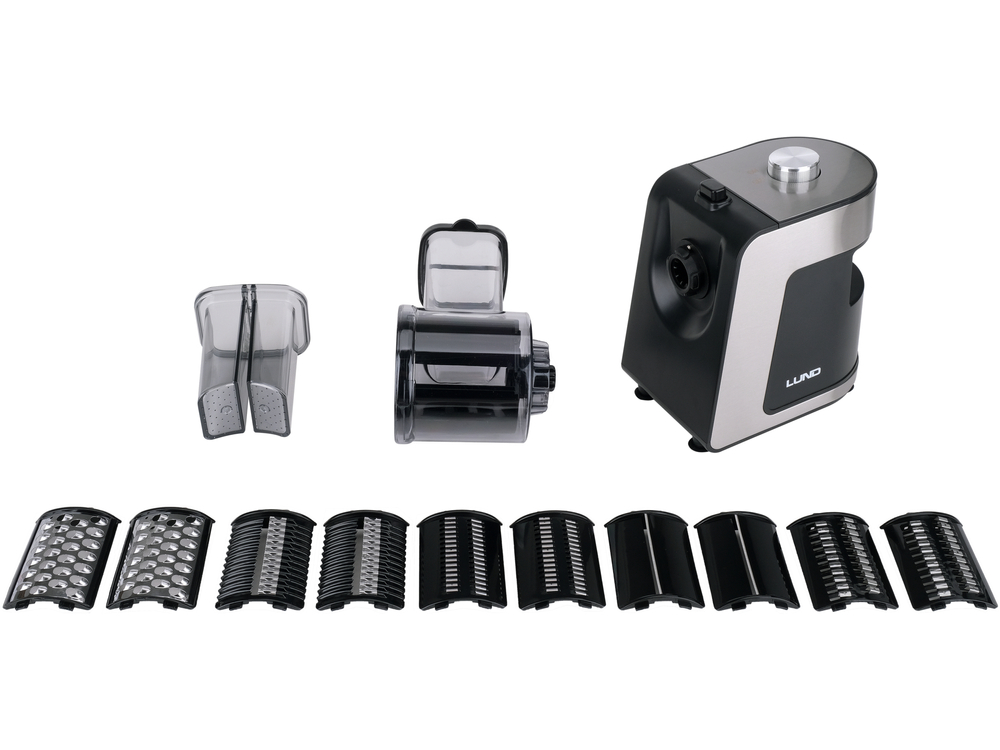 La picadora eléctrica de 250 W es un práctico ayudante en la cocina que te permite preparar ingredientes para tus platos favoritos en cuestión de segundos. Corta eficientemente las verduras en rodajas lisas, en zigzag y en virutas, lo que te facilita la creación de ensaladas coloridas, ensaladas o bases para platos principales.