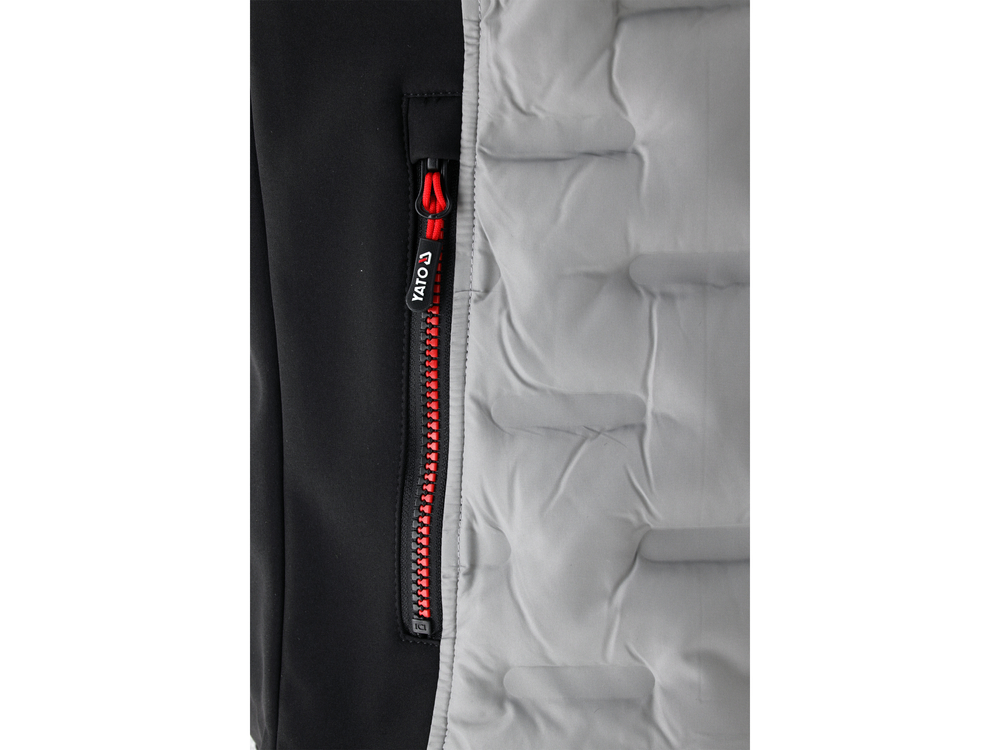 Los materiales de alta calidad, incluyendo el cuerpo acolchado y los paneles elásticos tipo softshell con laminado TPU, retienen eficazmente el calor, protegiendo las partes críticas del cuerpo sin limitar la movilidad. Además, los elementos reflectantes en los hombros aumentan la visibilidad en condiciones de iluminación limitada, mejorando la seguridad durante el trabajo al aire libre o en almacenes industriales. Los bolsillos ergonómicamente ubicados y los detalles prácticos, como el lazo para colgar, facilitan el almacenamiento de herramientas y documentos, así como el uso diario de la ropa.
