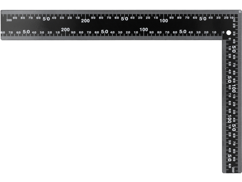 Кутник плоский, виготовлений з товстого листового металу, покритий чорним лаком з розбірливою білою міліметровою поділкою з одного боку та дюймовою поділкою з іншого.