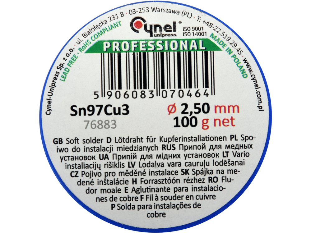 БЕЗСВИНЦЕВИЙ ПРИПІЙ З ФЛЮСОМ 2,5ММ, 100 Г, SN97CU3